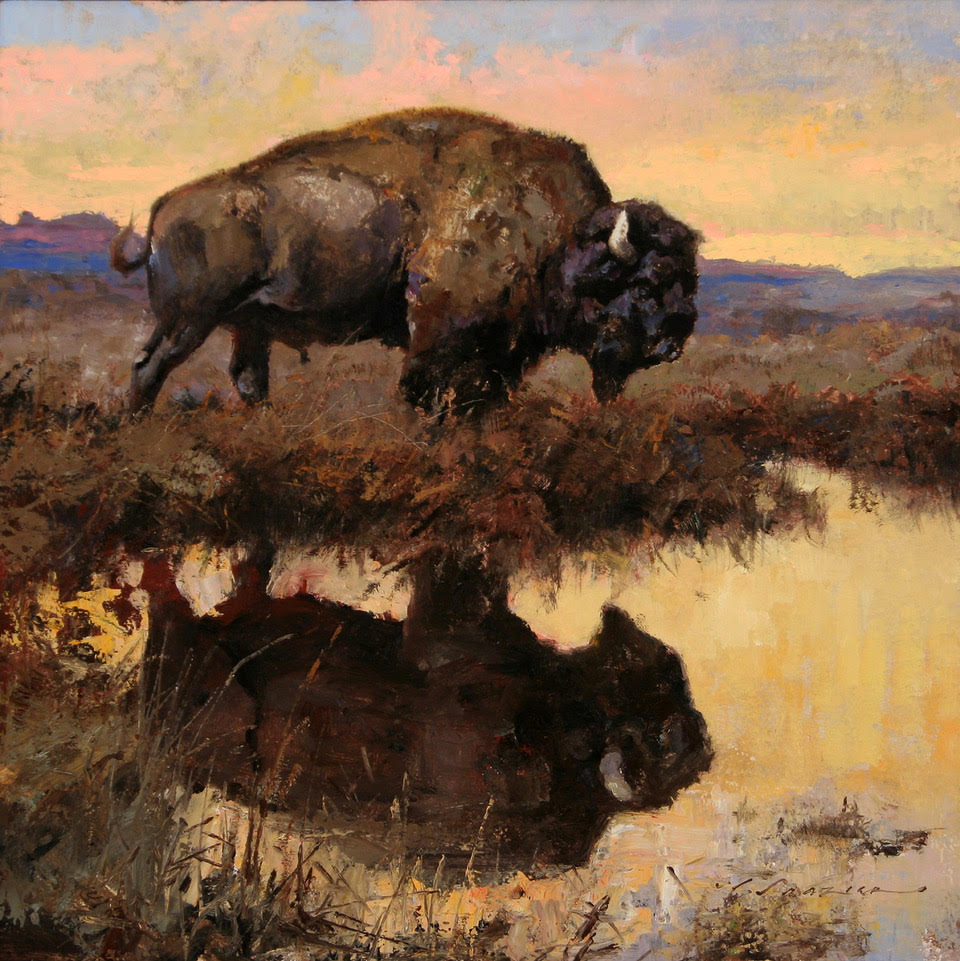 For generations, Native American Indians dreamed of the buffalo, prayed to him, told myths about him ~ made a sign for him using their hands and forefingers crooked inwards, and drew magic symbols of him on cave walls, rocks, their clothing and dwellings. The buffalo was “big medicine” and meant everything to them ~ food, clothing, shelter, survival. As I ponder on the stories told for generations of the west, and the importance of the American bison - I wanted to portray a lasting powerful image that represented the millions of buffalo that dwindled during the 1800’s. Thus, “Between Earth & Sky” was born ~ a lone bull standing alone on terra-firma reflecting the past and a hopeful future, a powerful lasting image of the western saga.